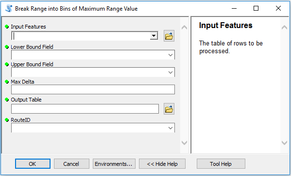 Syntax: BreakIntoSegmentsByMaxDeltaMeasure (Input_Features, Lower_Bound_Field, Upper_Bound_Field, Max_Delta, Output_Table, RouteID)